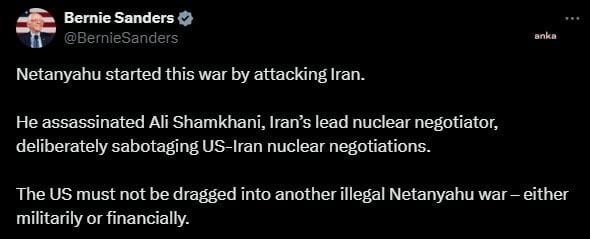 “Netanyahu bu savaşı İran’a saldırarak başlattı. İran’ın baş nükleer müzakerecisi Ali Shamkhani’yi öldürerek ABD-İran nükleer müzakerelerini taammüden sabote etti. ABD, Netanyahu’nun bir öbür yasadışı savaşına askeri ya da mali olarak sürüklenmemelidir.”