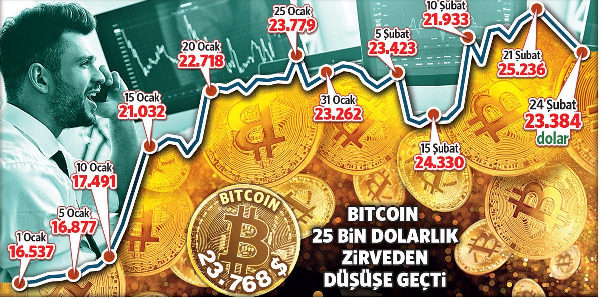 Kripto paralara yatırımcı ilgisinin azaldığı bir periyottan geçen Bitcoin, ABD Merkez Bankası’nın (Fed) daha fazla faiz artırımı yapacağı endişesiyle yine düşüşe geçti. 21 Şubat’ta 25.236 doları gören Bitcoin bu seviyeyi kıramadı ve istikametini aşağı çevirdi. 25.000 dolar direncine takılan Bitcoin dün 23.384 dolara kadar düşerken, misal biçimde Ethereum da 1.600 dolara kadar çekildi. ABD’de hem üretici hem de tüketici enflasyonunun beklentiden yüksek gelmesi, ‘Fed enflasyonla gayrette geri planda mı kalıyor’ kaygısını oluşturuyor. Bu bakımdan gelecek devirde Fed’in daha da şahinleşmesi ve enflasyonu bastırmak için faizi yüzde 6’ya kadar çıkarabileceği beklentisi artıyor. Gerçekten Fed yetkilileri de açıklamalarıyla bu beklentiyi destekliyor.